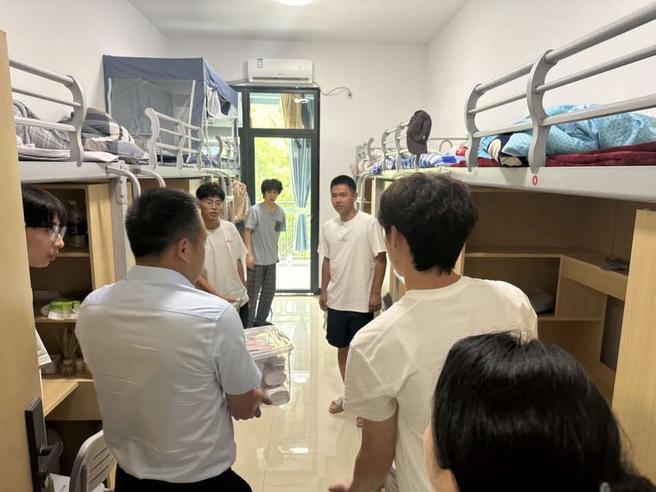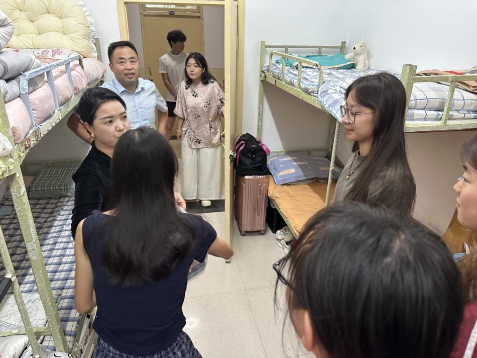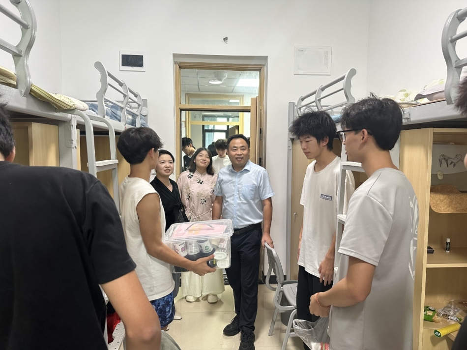 9月9日下午,体育学院院长肖宇翔、副书记黄微带领团总支书记袁稚雯、辅导员李文、曾真及导航学长团队深入新生宿舍开展走访慰问。院领导详细询问了新生的生活适应情况,耐心解答了同学们提出的问题,并为每位新生送上了精心准备的学院定制礼包。礼包内含学院文化手册、学习用品及生活必需品,体现了学院对新生的关怀与期待。