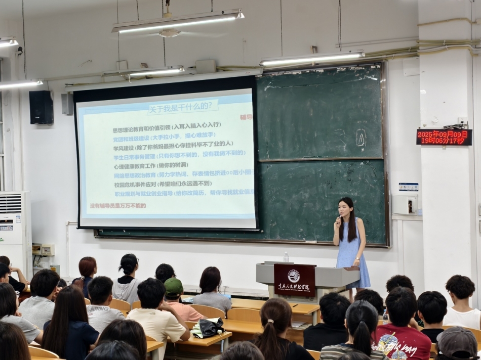 为帮助新生尽快适应大学生活,学院于9月9日下午分别在两个会场同步开展"开学第一课"专题教育活动。辅导员李文、曾真分别担任主讲,围绕"大学生活适应"“学业发展规划”"个人成长指引"等主题展开讲解。课程内容既包含理论指导,又融入往优秀学生的经验分享,为新生们描绘了大学生活的蓝图,指明了努力方向。