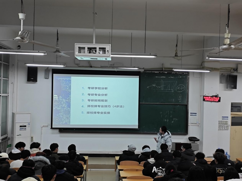 2025年11月23日晚,重庆人文科技学院体育学院在第五教学楼5101教室成功举办“做好数据分析,助力考研赢在起跑线”考研经验分享会。活动邀请李月老师担任主讲,面向百余位大二学生,围绕数据驱动的备考策略展开系统讲解,为低年级学子考研规划提供专业指导。