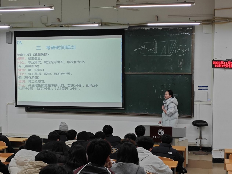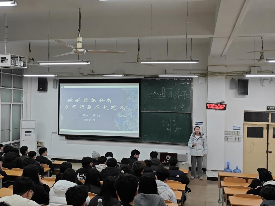 2025年11月23日晚,重庆人文科技学院体育学院在第五教学楼5101教室成功举办“做好数据分析,助力考研赢在起跑线”考研经验分享会。活动邀请李月老师担任主讲,面向百余位大二学生,围绕数据驱动的备考策略展开系统讲解,为低年级学子考研规划提供专业指导。